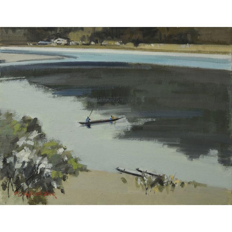 武石錦夫 「湯小屋への渡し」 油彩6号